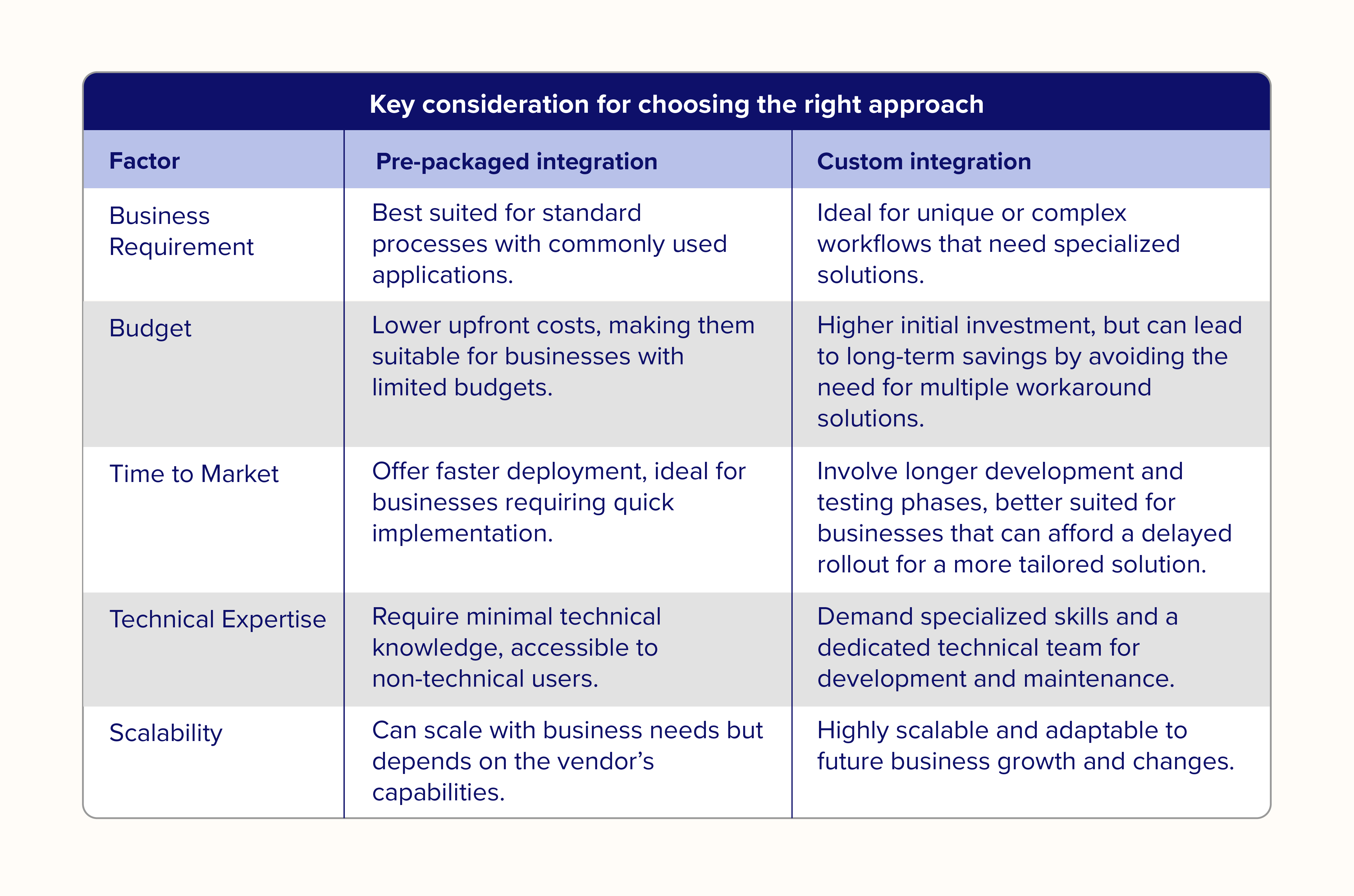 When deciding between pre-packaged and custom integrations, consider the following factors: